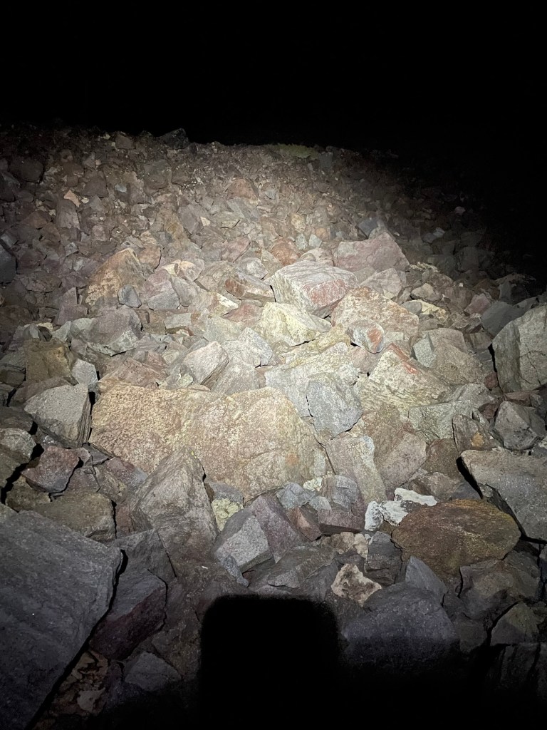 The trail became nonexistent just before sunset. I had a feeling deep down that it wasn’t going to be a welcomed couple of hours ahead. The map was showing the trail switch backing up a rocky face that we could still see. I wanted to explore it a bit to be able to make a conscious decision. Light was fading quickly. We climbed half way up without any luck in finding anything resembling a trail. Hagen wanted to get to the top, as it’s always hard to lose the elevation you just gained. We topped out as the dark set in. I rushed around the knob to get sight on what was ahead of us. What I found wasn’t what I had hoped for. It was one huge rock slide and within minutes I was using my headlamp to see a few feet in front of myself. This was going to be a challenge with two good legs. My partner had two good trekking poles and two bad legs. I had only taken a couple of sips from my water bladder in the last hour or so. I wasn’t dehydrated but knew my partner was and would soon be completely out. I was tired earlier, but now, I am numb. It didn’t hurt in one single spot. I knew this was just getting started and I had to reset to get started with it.